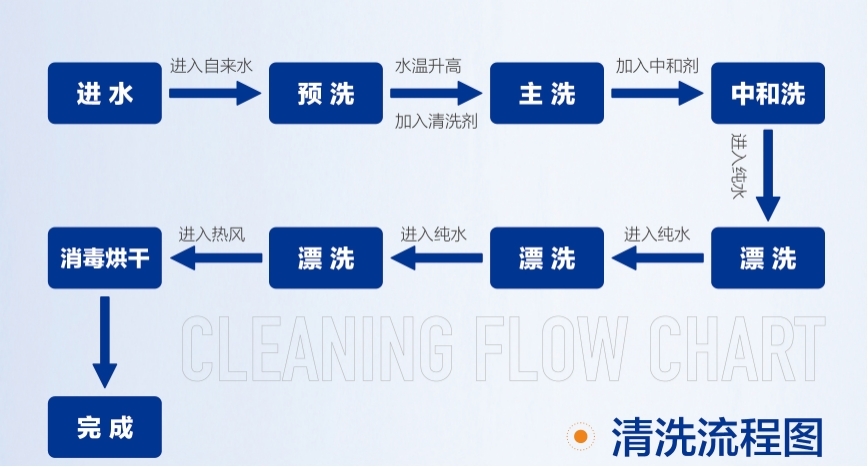 ②主洗:進自來水,進入堿性清洗劑,可以加熱到93攝氏度清洗;