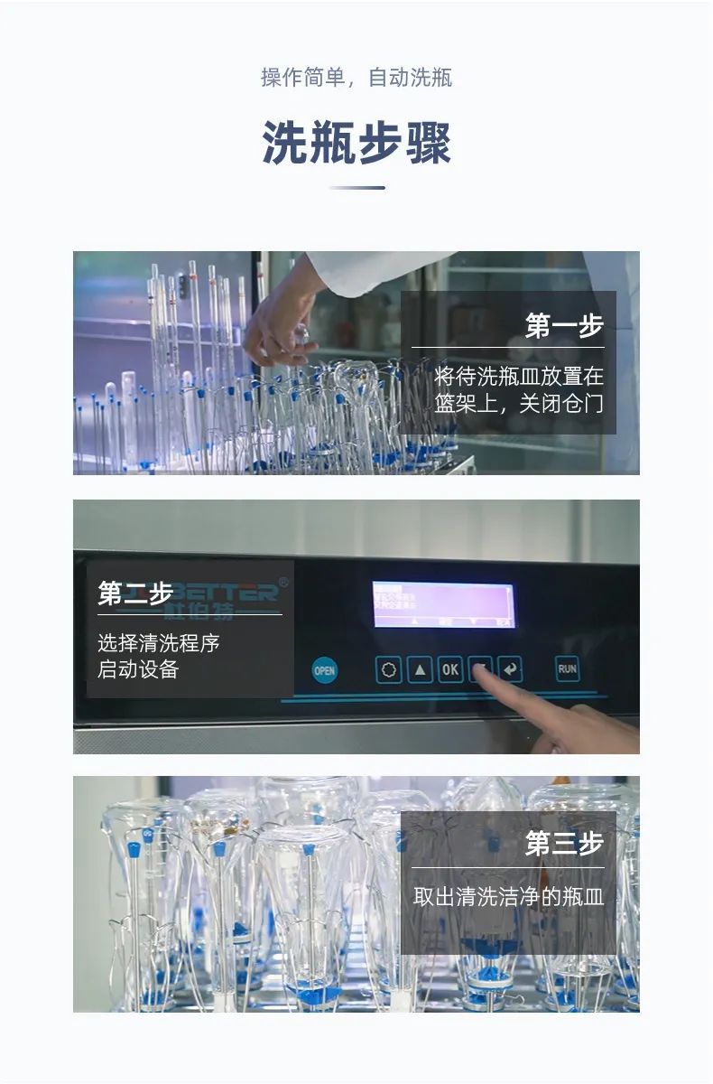 (2)它嚴(yán)格執(zhí)行設(shè)定好的清洗程序,更系統(tǒng)化、精細(xì)化、標(biāo)準(zhǔn)化。而人工清洗難免會(huì)因?yàn)榍逑慈藛T經(jīng)驗(yàn)、經(jīng)歷等問題,難以實(shí)現(xiàn)標(biāo)準(zhǔn)化清洗。并且一些瓶皿清洗要求上不能使用刷子等工具,無疑也增加了人工清洗難度。