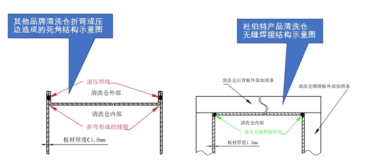 所謂的一體成型倉(cāng)體,無法真的做到一體成型,而是通過對(duì)材料折彎或者壓邊來完成。這樣的設(shè)計(jì)結(jié)構(gòu),不可避免的造成清洗倉(cāng)倉(cāng)體縫隙過大,同時(shí)為了倉(cāng)體的密閉性會(huì)在倉(cāng)體外部進(jìn)行焊接。由于設(shè)計(jì)缺陷,倉(cāng)體縫隙即容易藏污納垢又容易有殘留,造成二次污染,從而影響清洗效果,無法真的達(dá)到清洗目的。杜伯特清洗倉(cāng)不銹鋼倉(cāng)體,完全杜絕了二次污染的隱患。并且會(huì)在使用一段時(shí)間后,倉(cāng)體內(nèi)部愈加明亮。而普通的鏡面不銹鋼倉(cāng)體,會(huì)隨著使用增加,導(dǎo)致倉(cāng)體內(nèi)部水漬明顯、劃痕肉眼可見增多,倉(cāng)體越來越模糊,影響實(shí)際使用中的視覺感受。